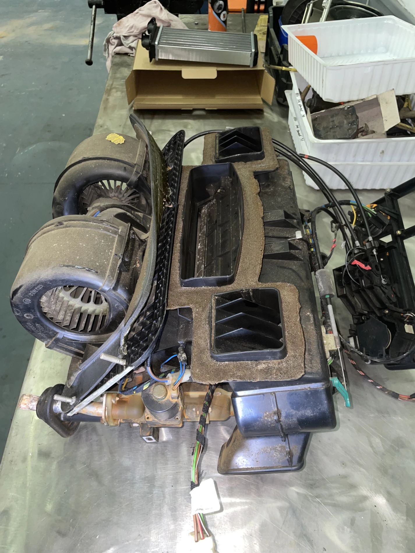 Dans un premier temps, le système de chauffage de l’habitacle a fait l’objet d’une remise à niveau complète. Cette opération a nécessité le remplacement du radiateur de chauffage, impliquant la dépose intégrale du tableau de bord, ainsi que le démontage des éléments de ventilation, des gaines de distribution d’air et des faisceaux électriques associés. Le robinet de chauffage, élément essentiel pour la régulation du débit du liquide de refroidissement vers l’échangeur thermique, a été remplacé afin d’assurer une parfaite étanchéité et un fonctionnement précis. Les durites de refroidissement liées au circuit de chauffage ont été contrôlées et remplacées préventivement afin de prévenir tout risque de fuite ou de défaillance sous pression.