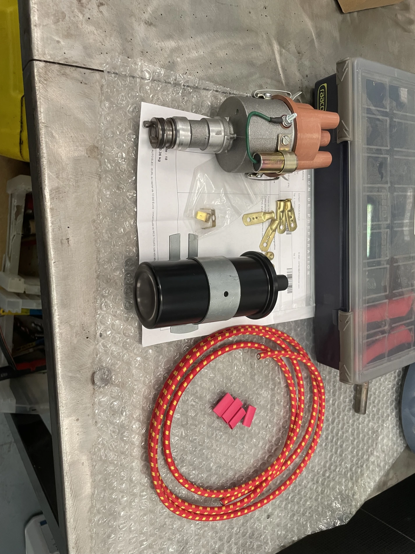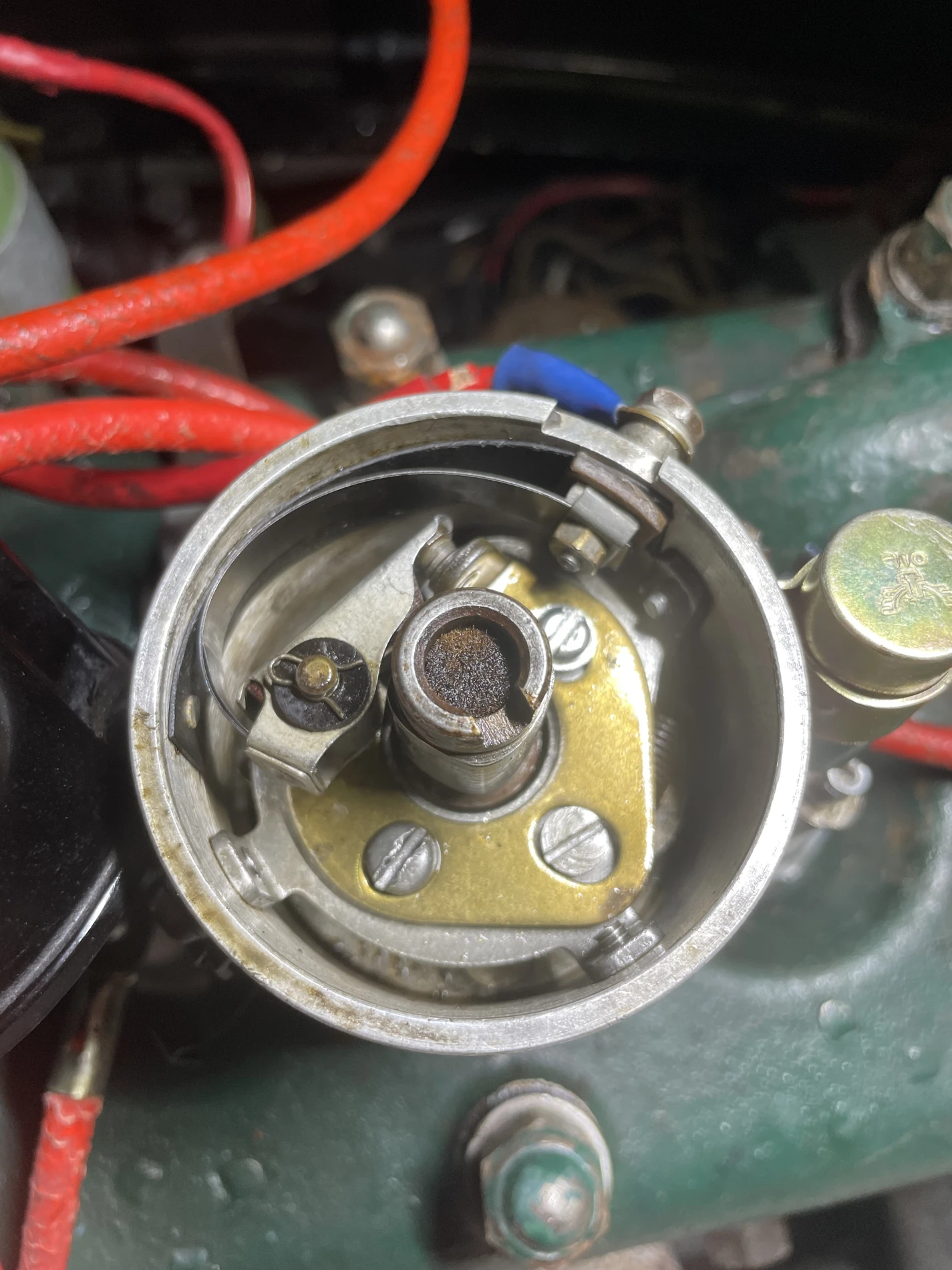 Le système d’allumage a également fait l’objet d’une remise à neuf, avec le remplacement complet de l’allumeur, des bougies et des fils haute tension de style époque, respectant l’authenticité visuelle et technique du véhicule. Une mise au point moteur approfondie a été réalisée, incluant le réglage précis de l’avance à l’allumage, paramètre déterminant pour optimiser le rendement moteur, la souplesse de fonctionnement et la longévité des composants mécaniques.
