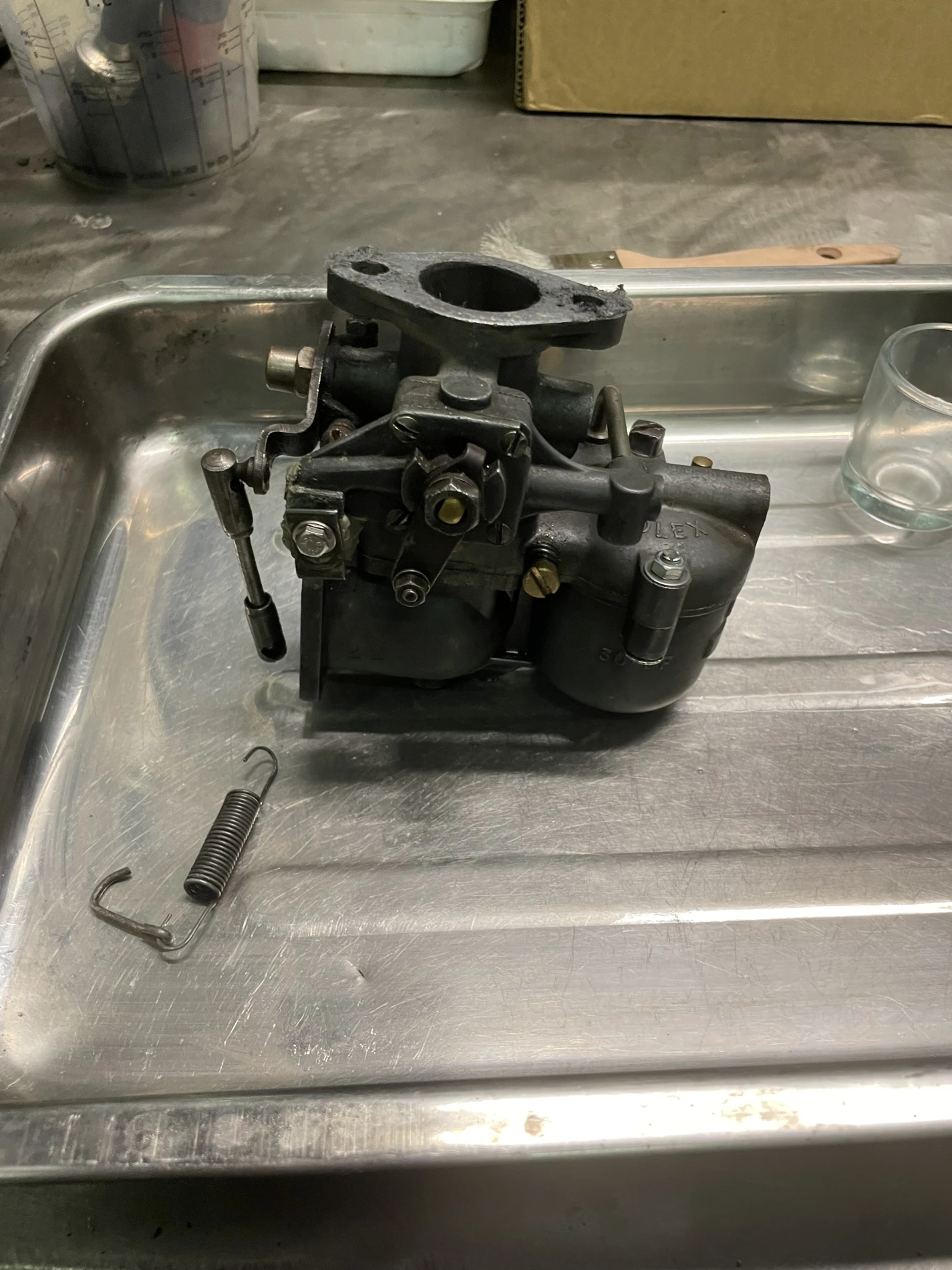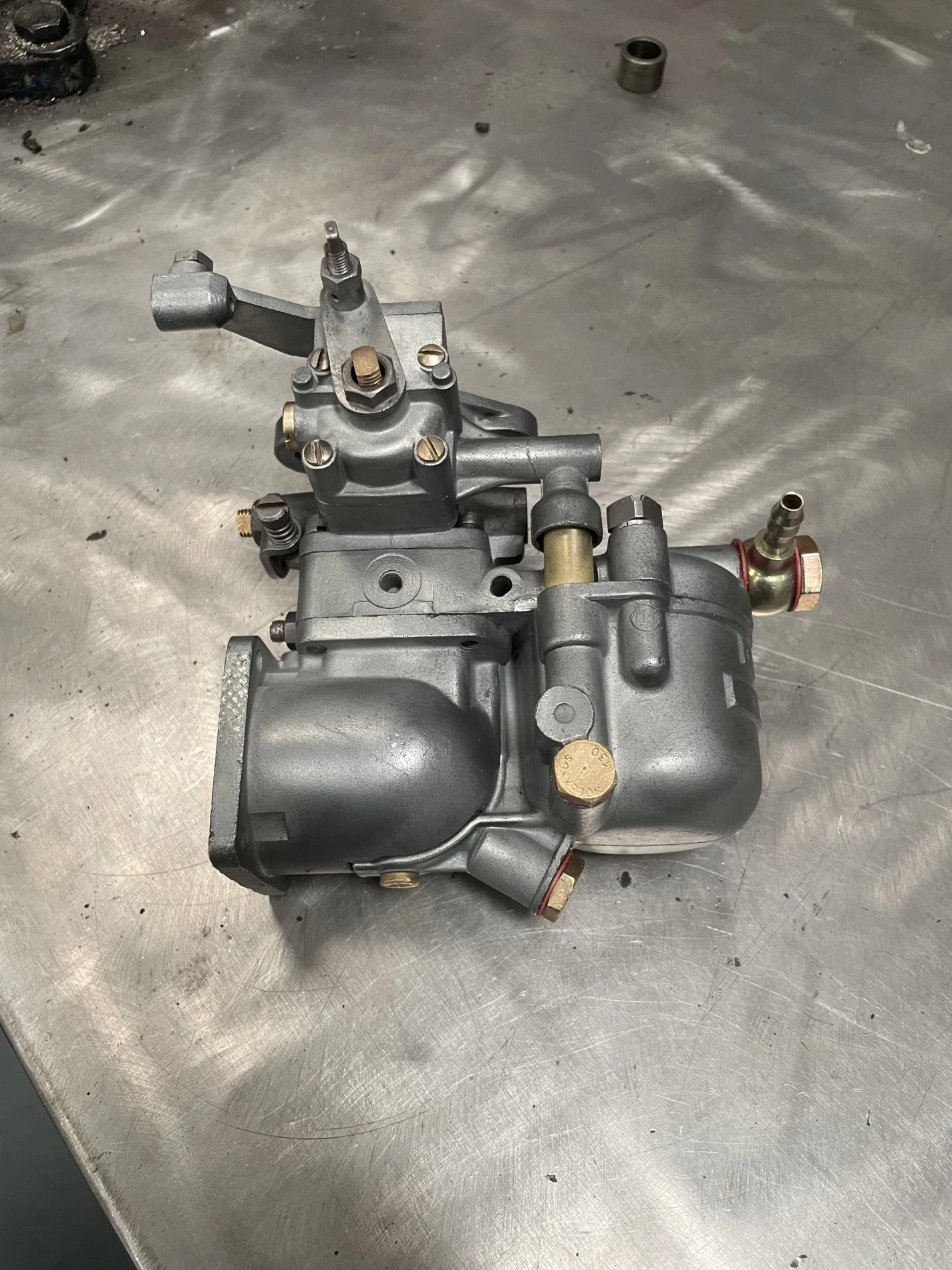 L’intervention a débuté par une révision complète du carburateur Solex d’origine, organe essentiel à l’alimentation du moteur. Cette opération a consisté en un démontage intégral, un nettoyage approfondi des conduits internes, le contrôle des gicleurs, du flotteur et du pointeau, ainsi que le remplacement des joints afin d’assurer une carburation stable et homogène. Les réglages de richesse et de ralenti ont ensuite été effectués conformément aux préconisations techniques de l’époque.
