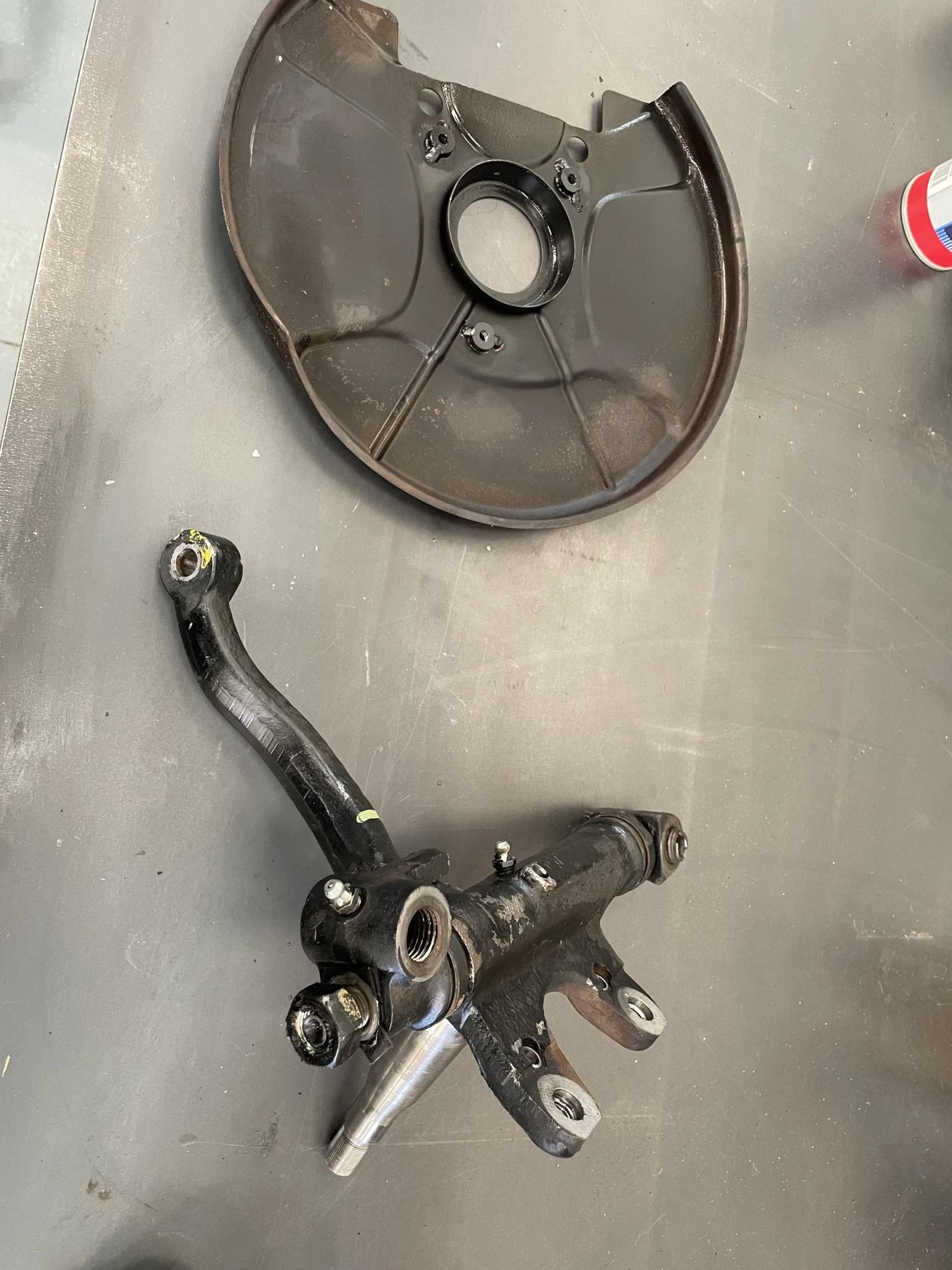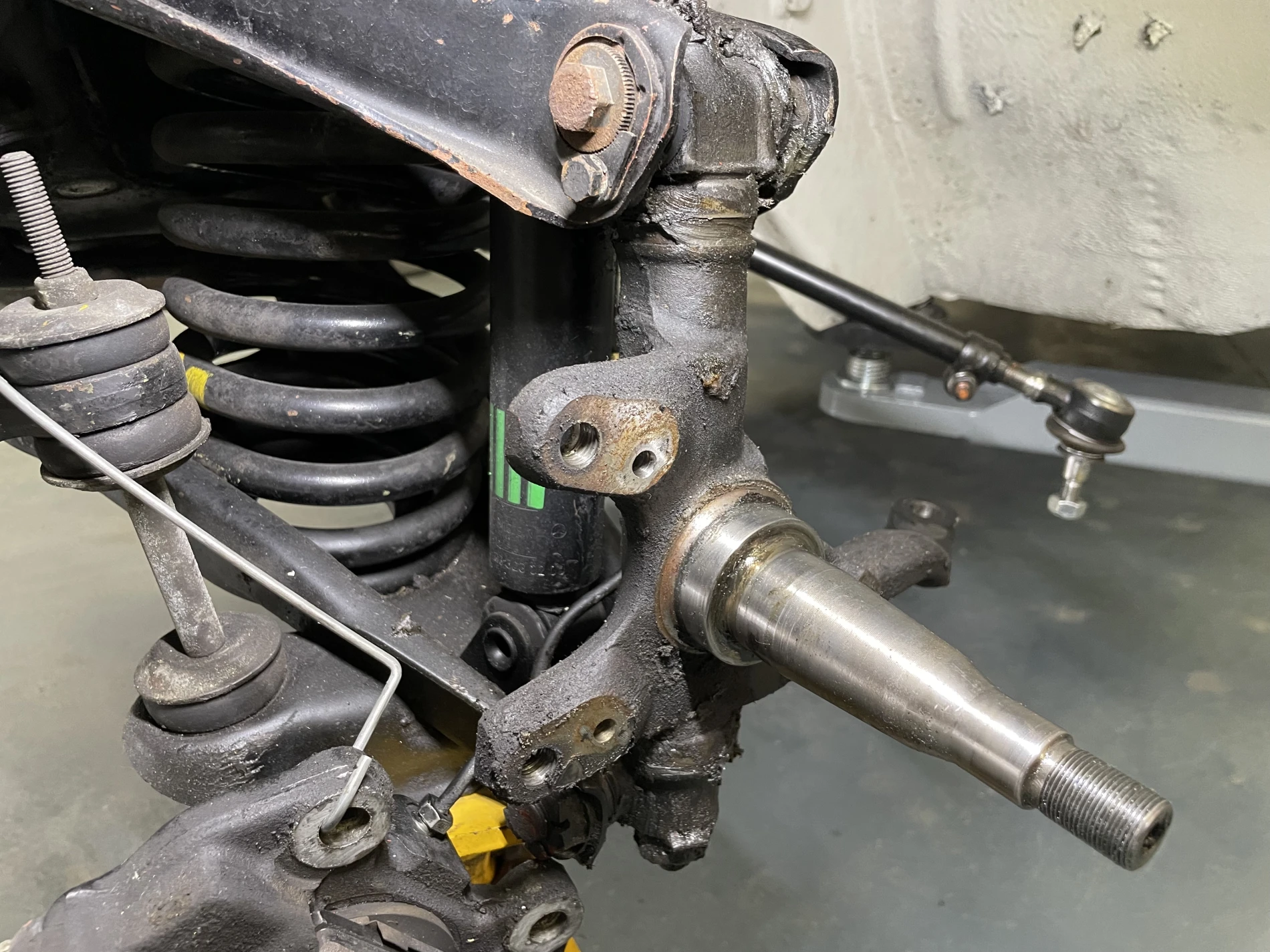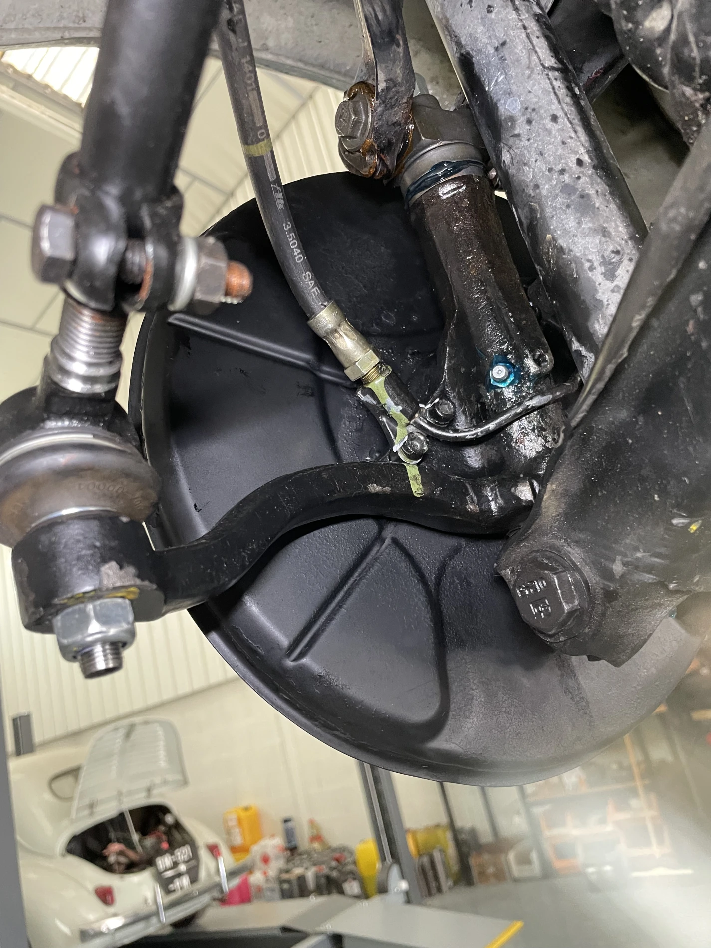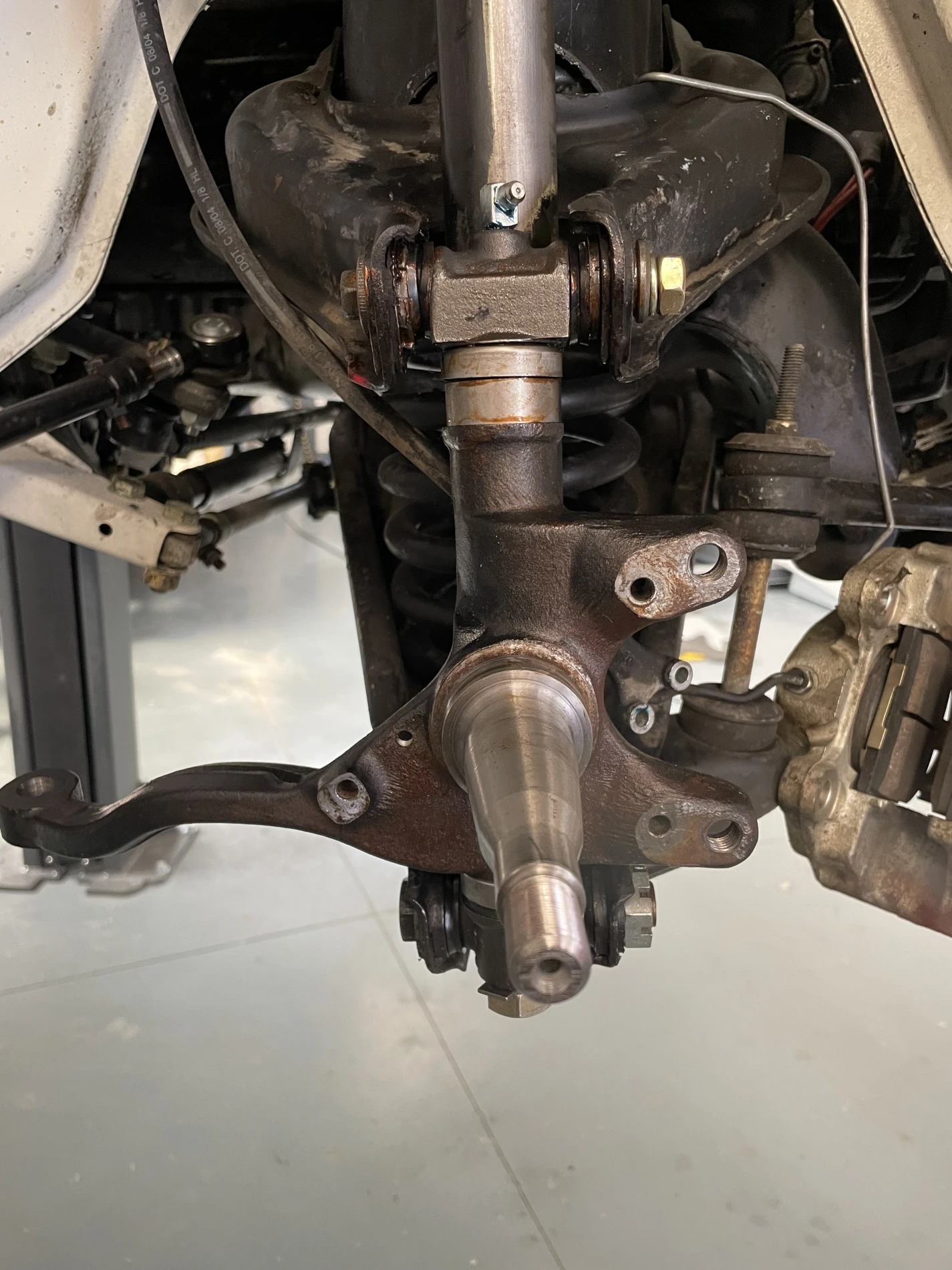 Les travaux ont débuté par le remplacement des pivots de train avant, éléments essentiels assurant la liaison entre les porte-fusées et les bras de suspension. Cette opération délicate a nécessité la dépose complète des composants concernés, le contrôle des axes, bagues et portées, ainsi qu’un remontage avec respect strict des tolérances constructeur. Le remplacement de ces pivots permet de restaurer la précision directionnelle, de supprimer les jeux excessifs et d’améliorer la stabilité du véhicule en dynamique.